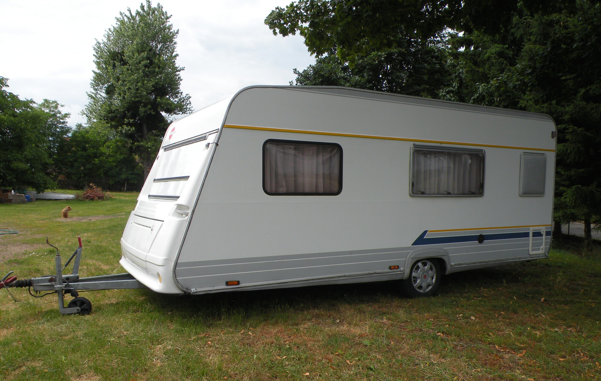 Przyczepa 5 osobowa 2001 r., DMC 1100kg, dł. 5,0m, szer. 2,20m, 2 sypialnie (2os. + 3os.); kuchnia, zlewozmywak, lodówka, łazienka: umywalka, brodzik, prysznic, WC-kaseta, ogrzewanie elektryczne, podgrzewacz wody, klimatyzator, przedsionek, wymiary spań: 120 x185cm, 140 x 195cm; rolety i moskitiery, stabilizator toru jazdy, wtyczka 13.